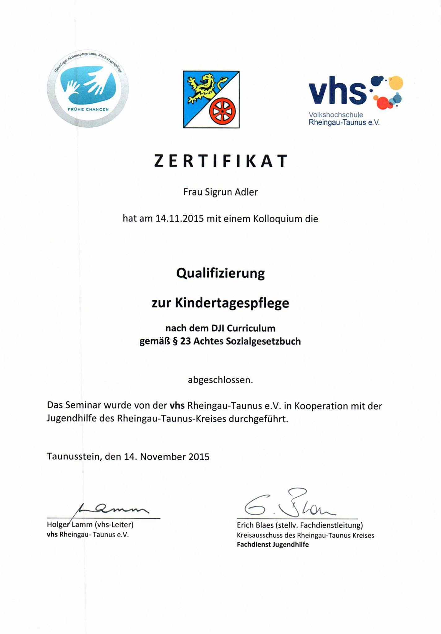 Darüberhinaus habe ich das Zertifikat "Gesundheitsmanagement" und bin ausgebildet zum Thema Kinderrechte und Partizipation im pädagogischen Alltag.